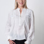 Nossa ! Blouse Ample Blanche brodée ton sur ton avec un jeu de plis et de la dentelle sur le devant, boutons en en nacre. 100% coton