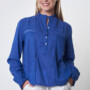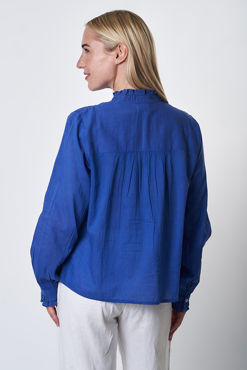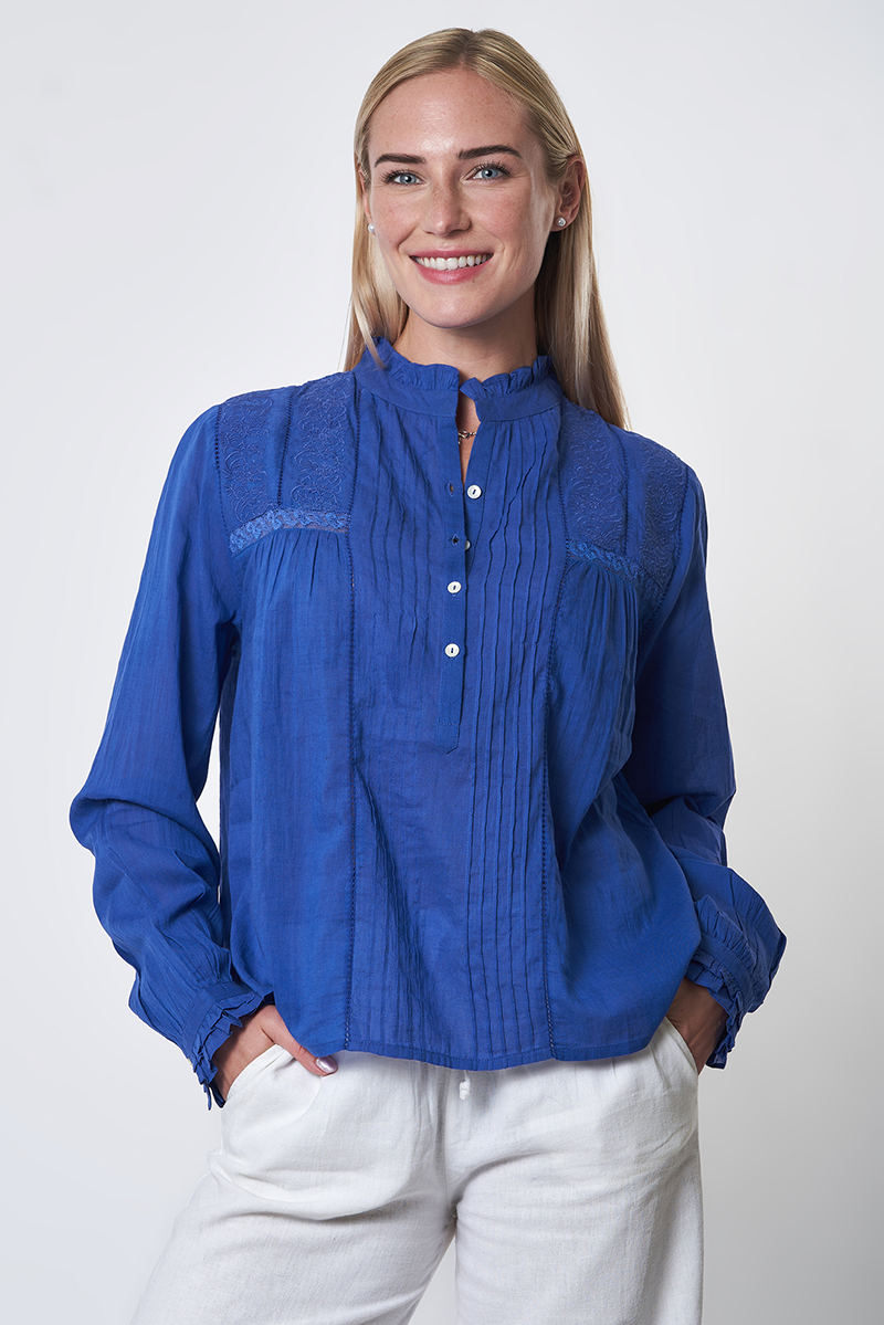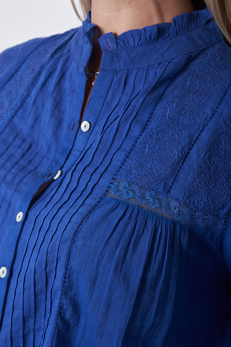Nossa ! Blouse Ample Bleu Royal brodée ton sur ton avec un jeu de plis et de la dentelle en cotton sur le devant, boutons en en nacre. 100% voile de coton