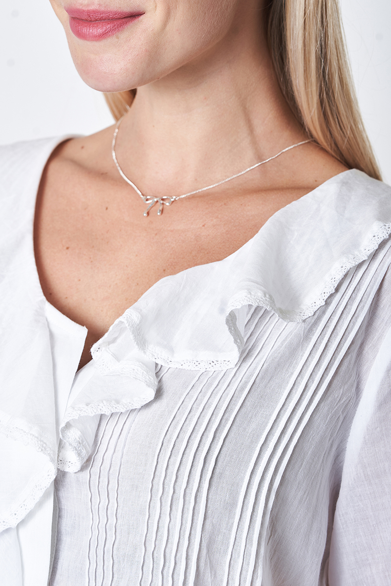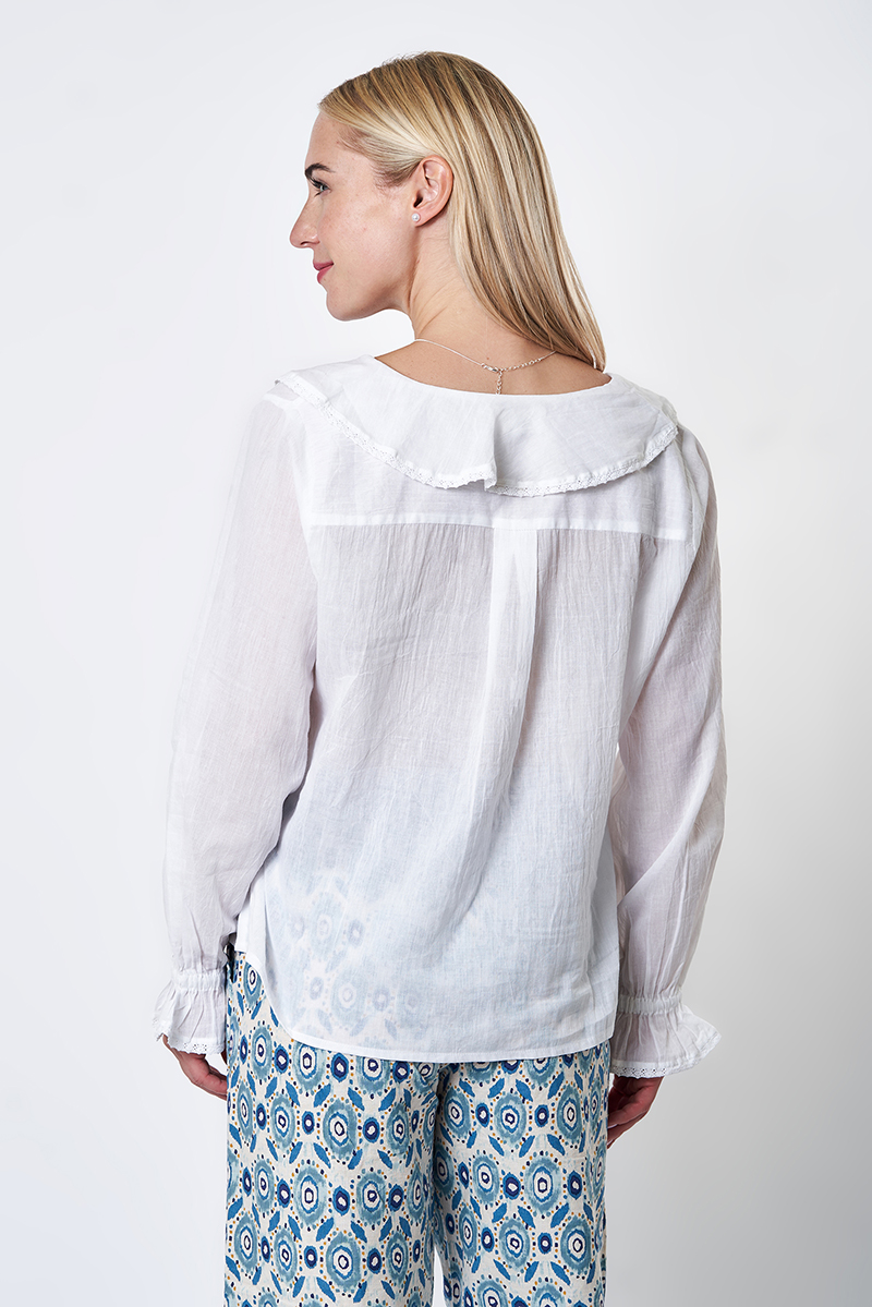 Nossa ! Chemise à Volants Blanche, avec jeu de plis sur le devant, agrémentée des fines dentelles en coton, boutons en en nacre. 100% Voile de Coton.