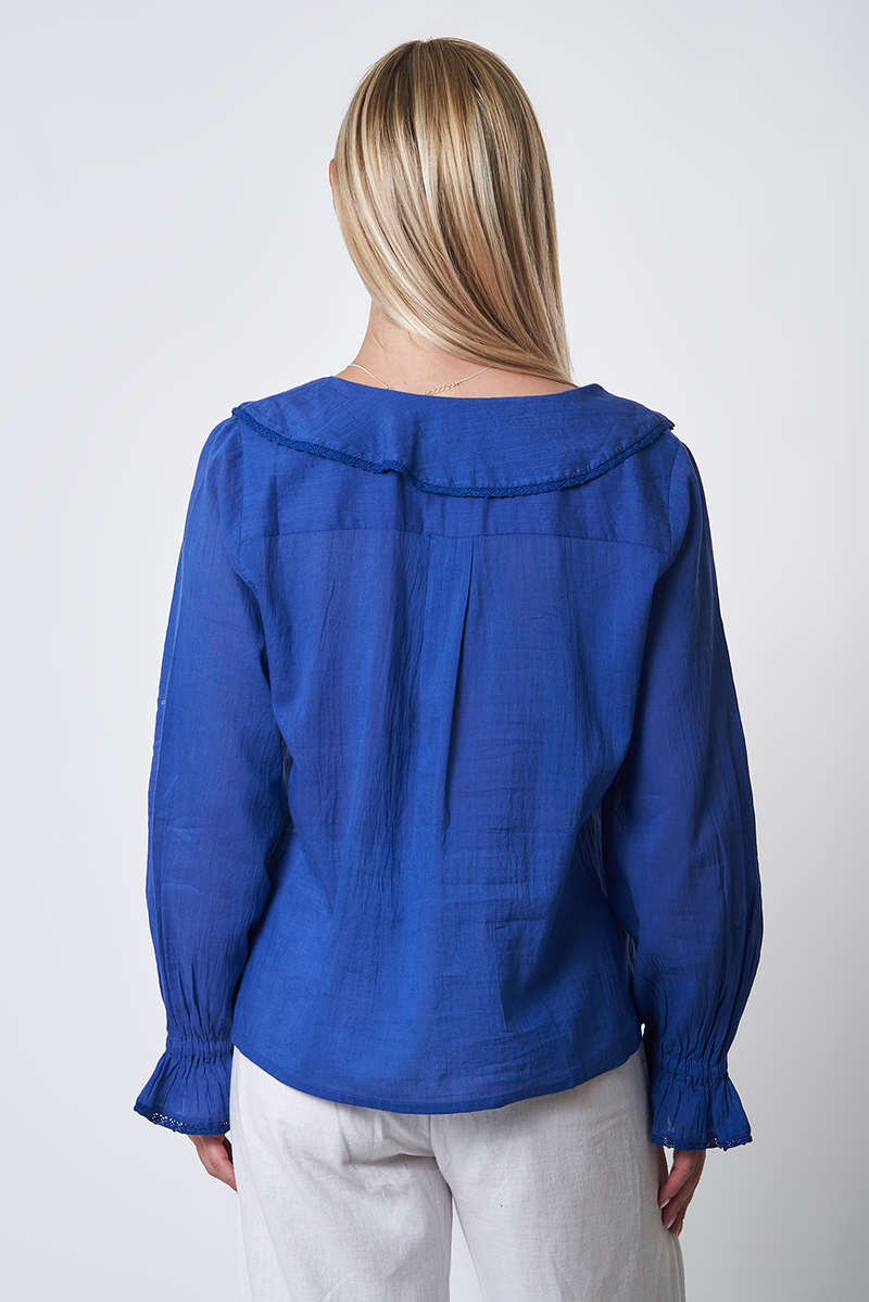Nossa ! Chemise à Volants Bleu Royal, avec jeu de plis sur le devant, agrémentée des fines dentelles en coton, boutons en en nacre. 100% Voile de Coton.