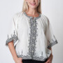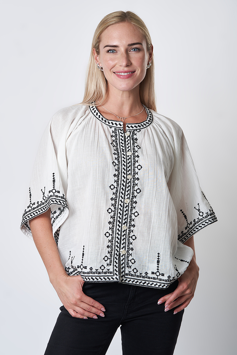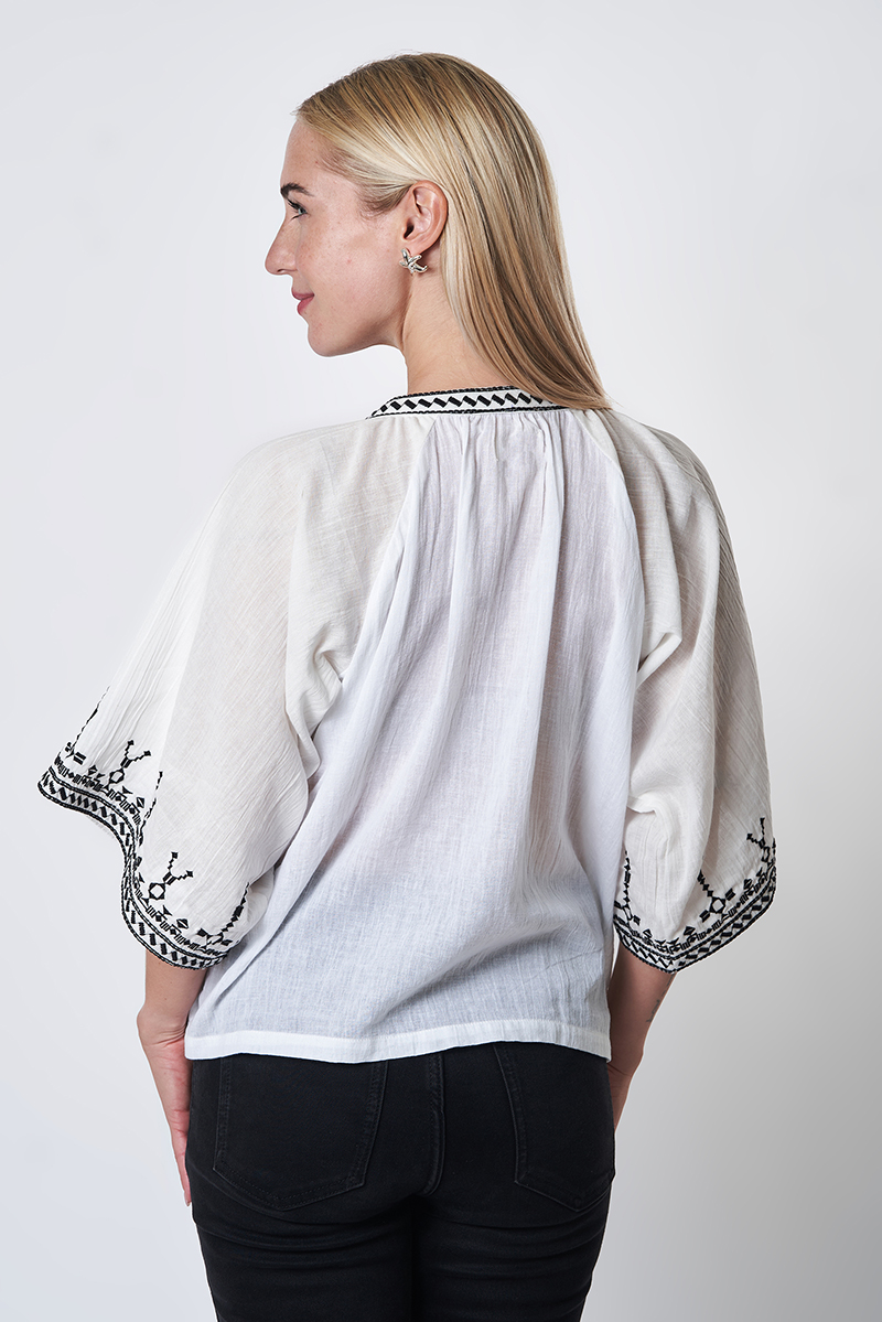 Nossa ! Chemise Ample Blanche, Manches aux Coudes, Brodée de Noir sur le devant, l’encolure et les manches, boutons en nacre. 100% Gaze de Coton.