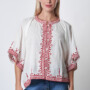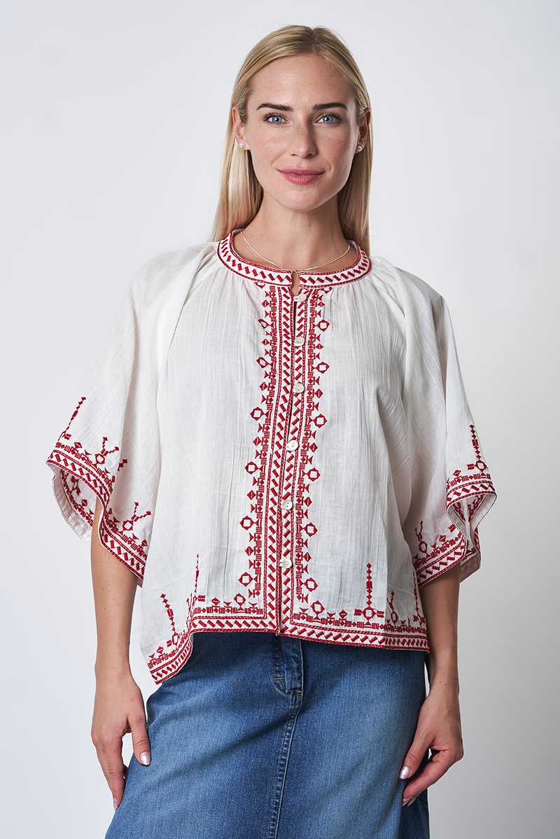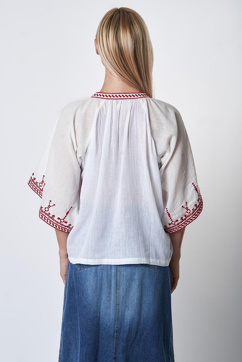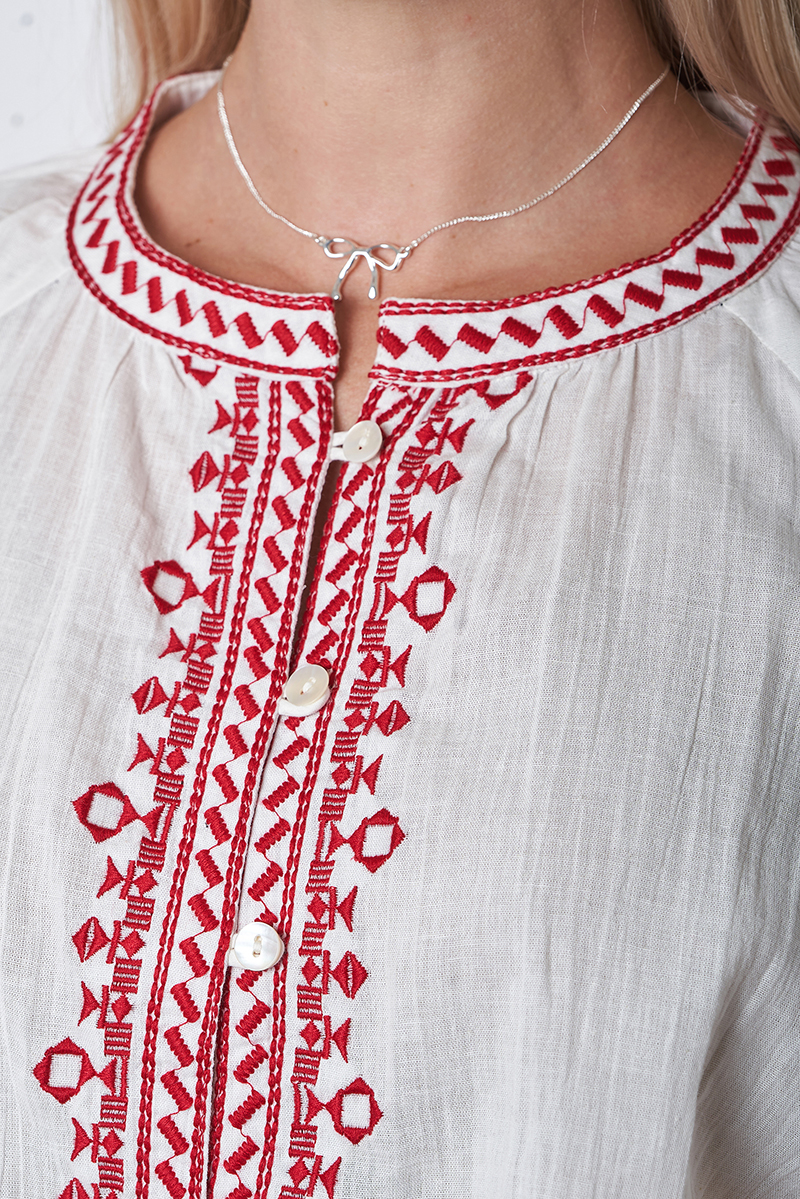 Nossa ! Chemise Ample Blanche, Manches aux Coudes, Brodée de Rouge sur le devant, l’encolure et les manches, boutons en nacre. 100% Gaze de Coton.