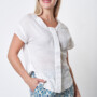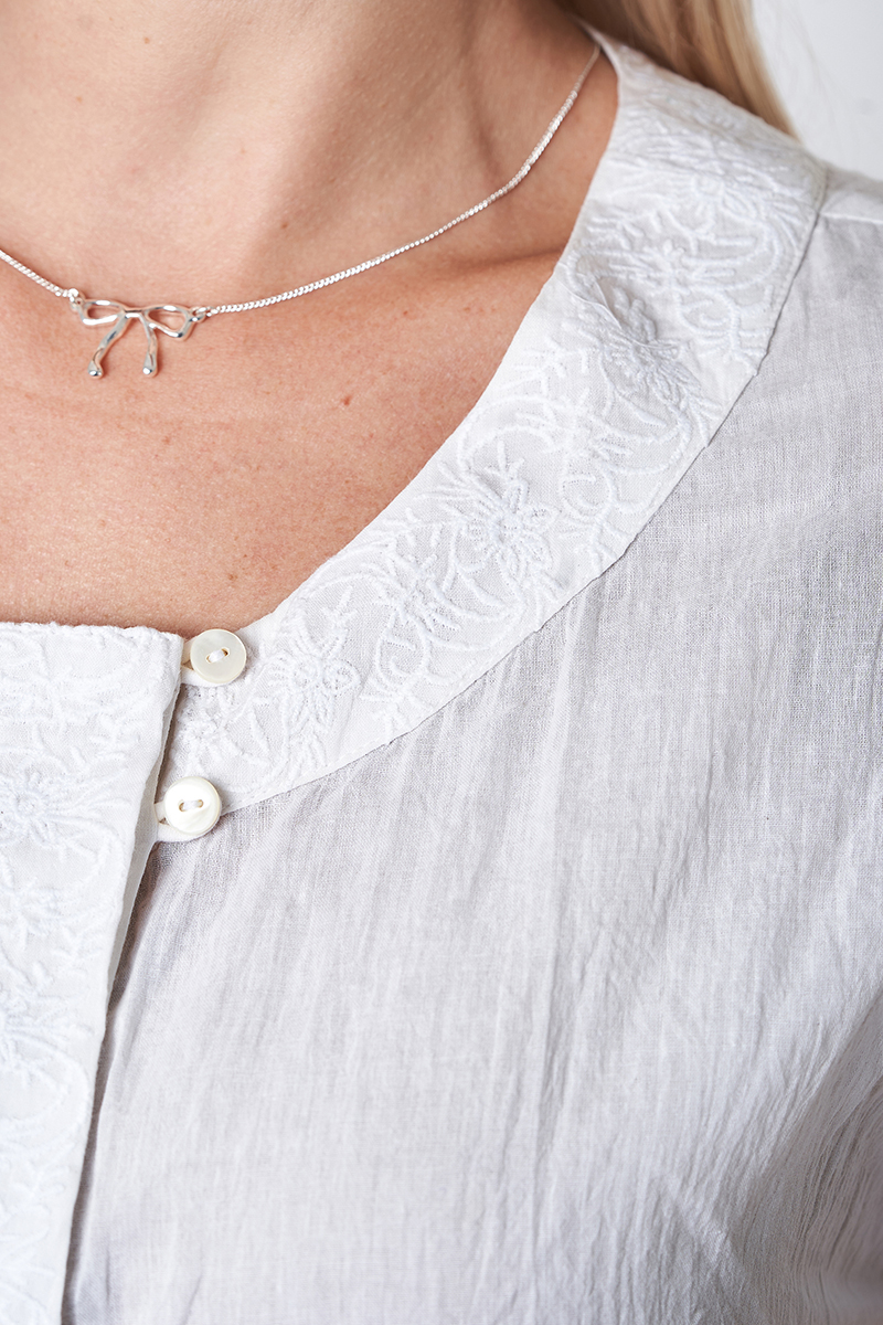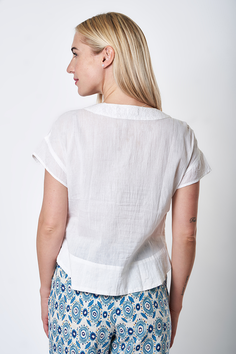 Nossa ! Chemisette Blanche Manches Kimono Courtes, Brodée sur le devant et l’encolure, patte de boutonnage cachée, boutons en nacre. 100% Gaze de Coton.