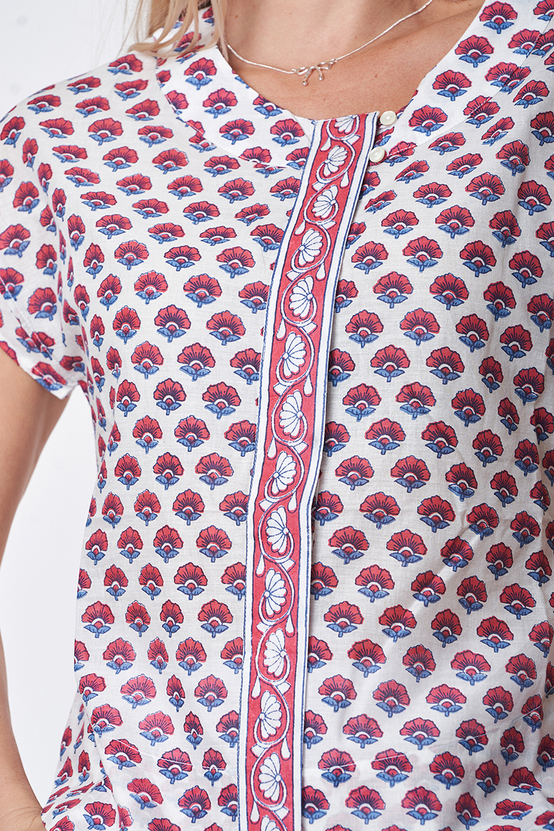 Nossa ! Chemisette Manches Kimono Courtes, Imprimée Fleur Rouge, patte de boutonnage cachée, boutons en nacre. 100% Gaze de Coton.
