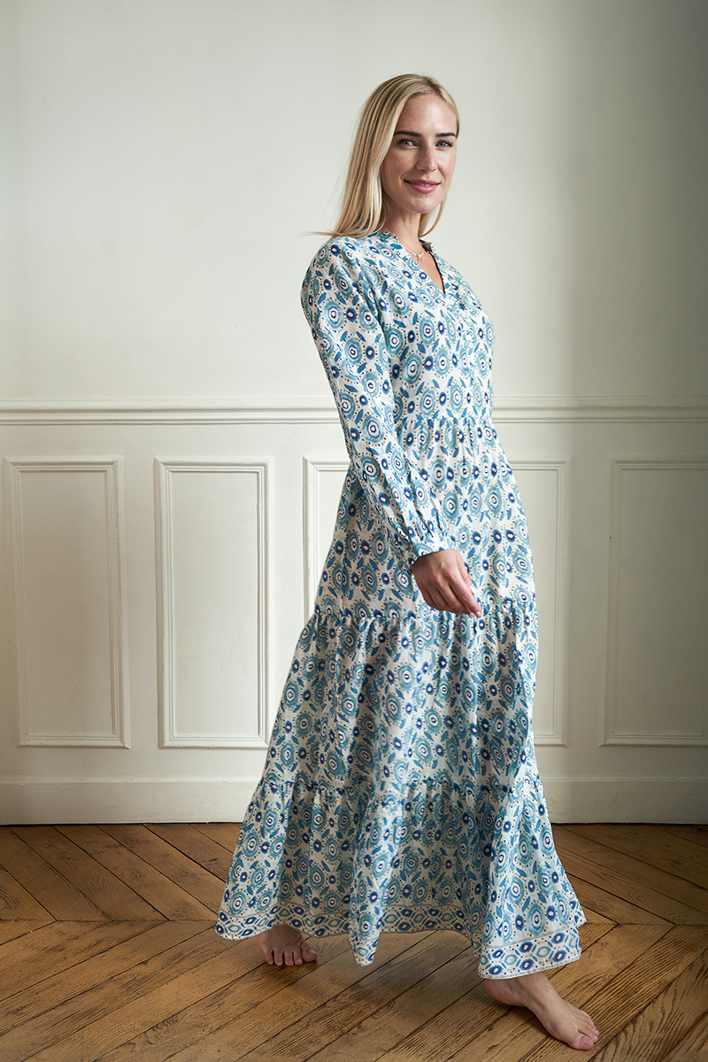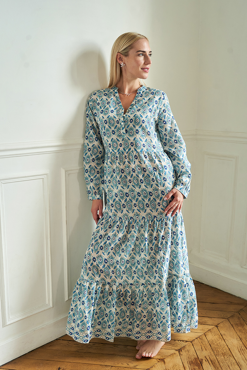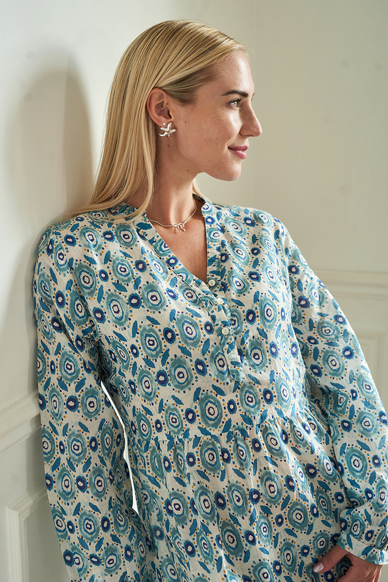 Nossa ! Robe-Chemise Longue, Imprimé manuellement au cadre, boutons en en nacre. 100% Voile de Coton.